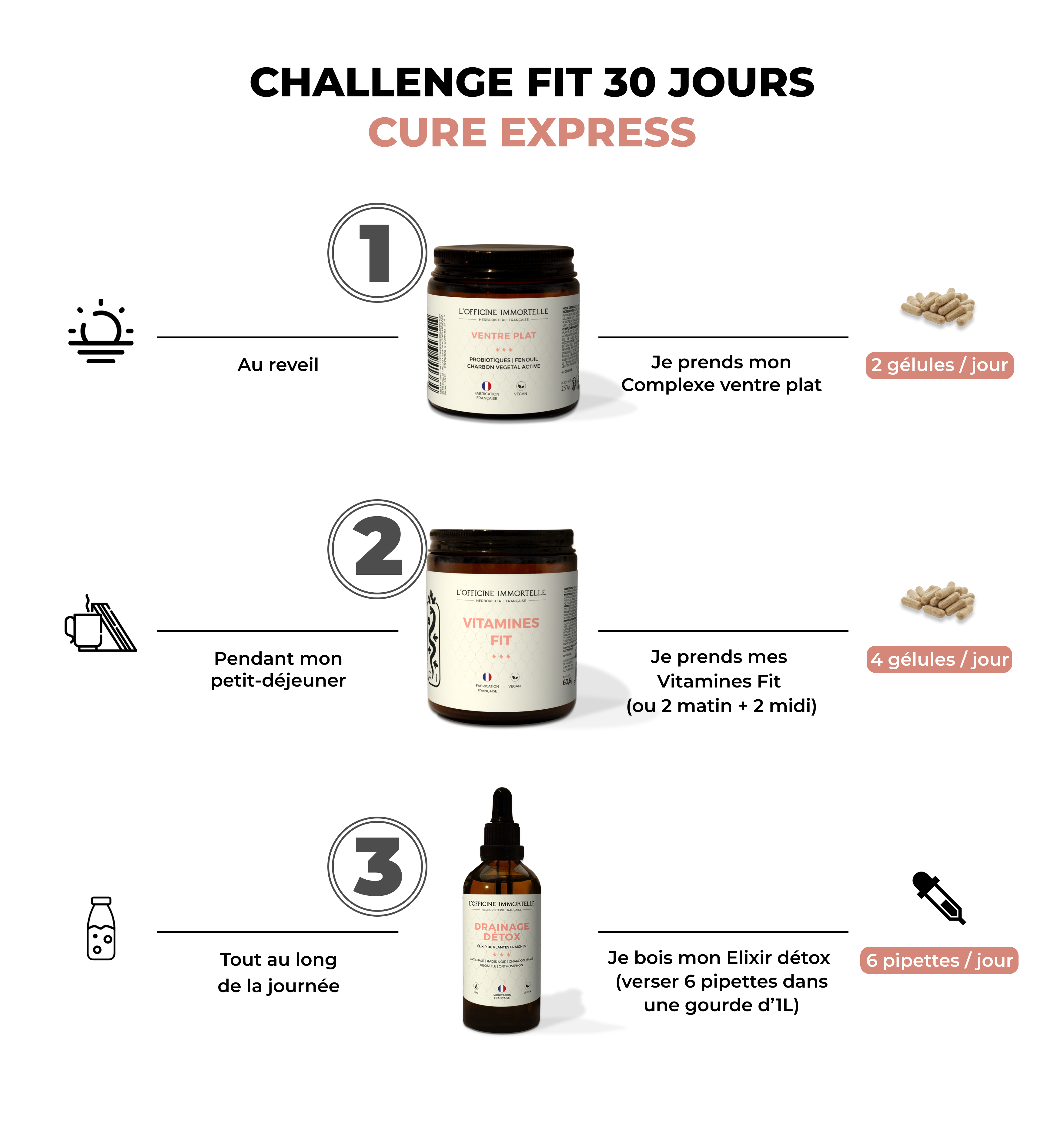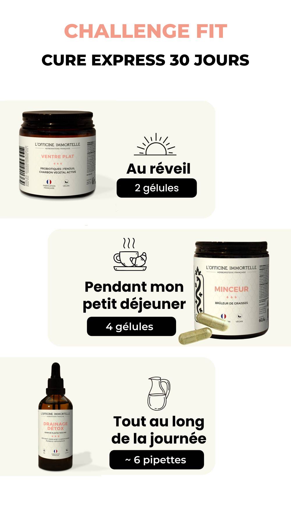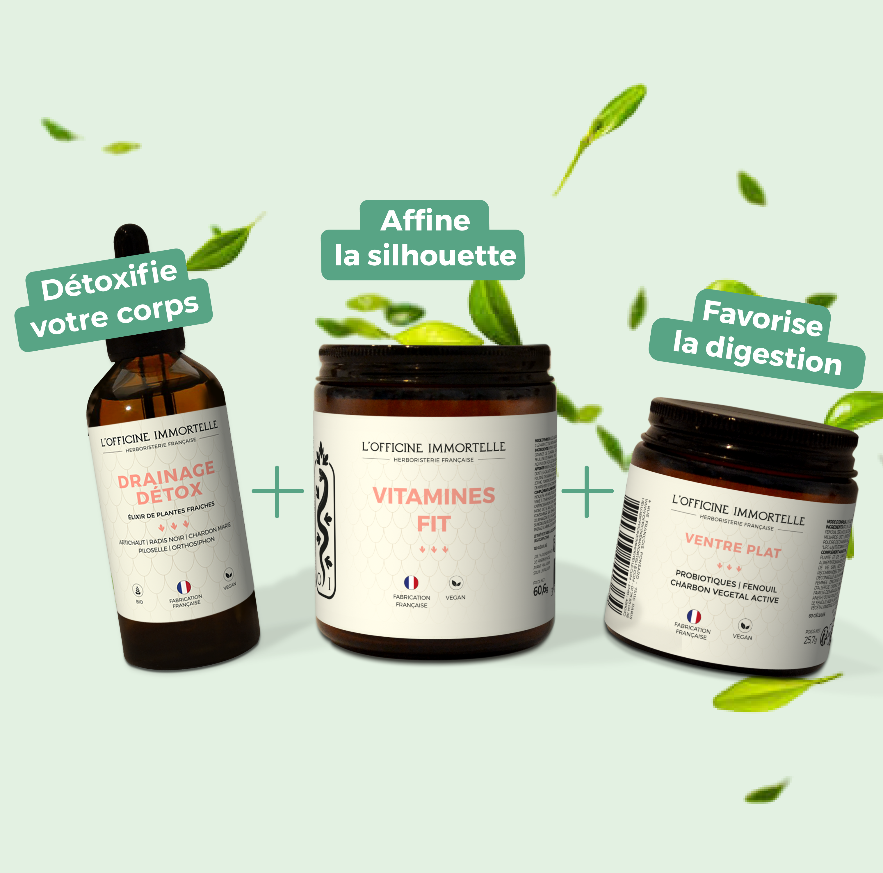 With our detox elixir based on artichoke, black radish, and milk thistle, purify your body, while the Fit Vitamins complex activates your metabolism thanks to guarana and green tea. The Flat Stomach Complex completes this trio by promoting optimal digestion and better weight management.