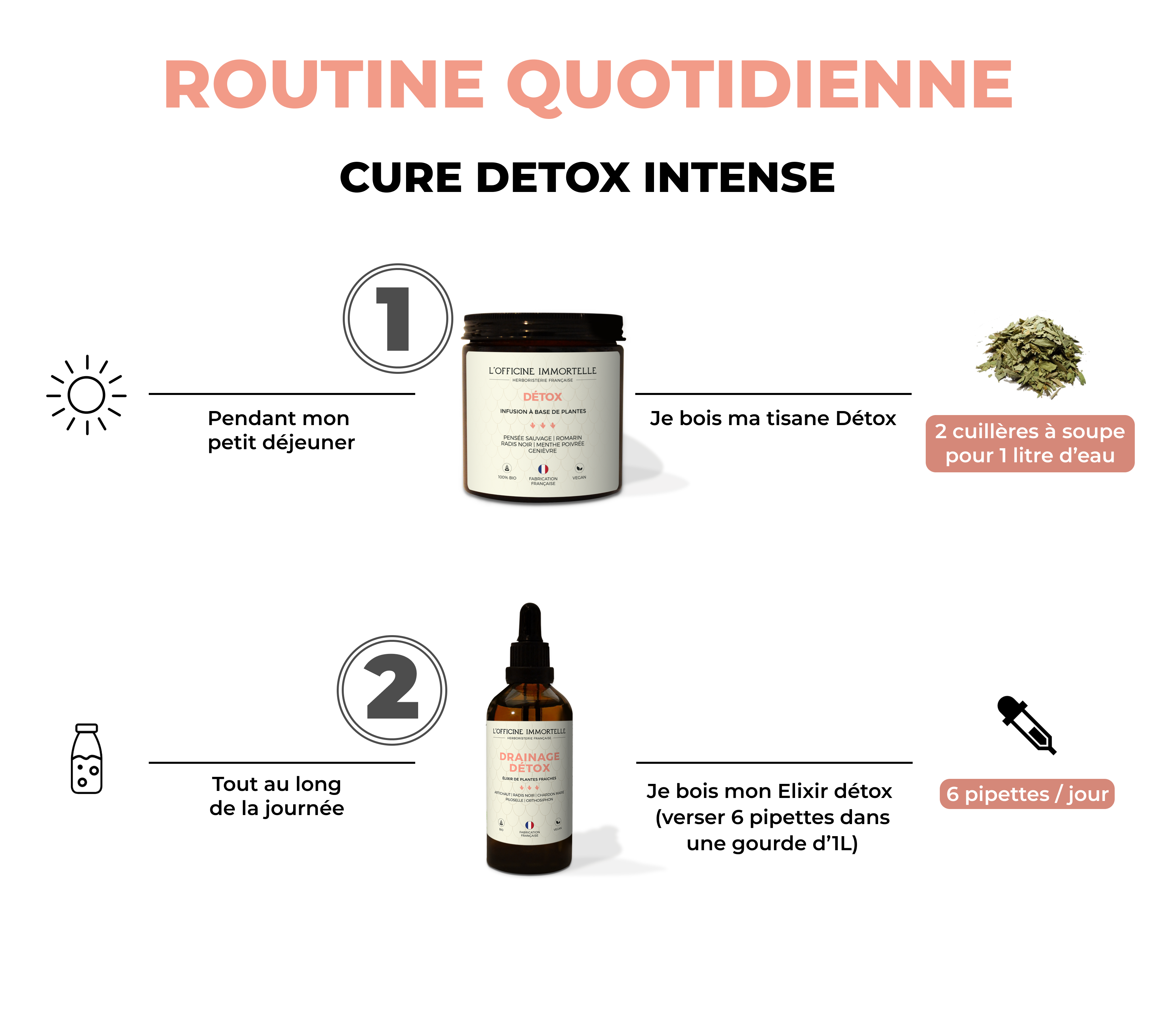 Detox herbal tea: 55g glass jar. 1 tablespoon for a bowl of cold water. Bring to the boil for 1 minute and let infuse for 3 minutes. Drink warm, during the day, for 1 week.