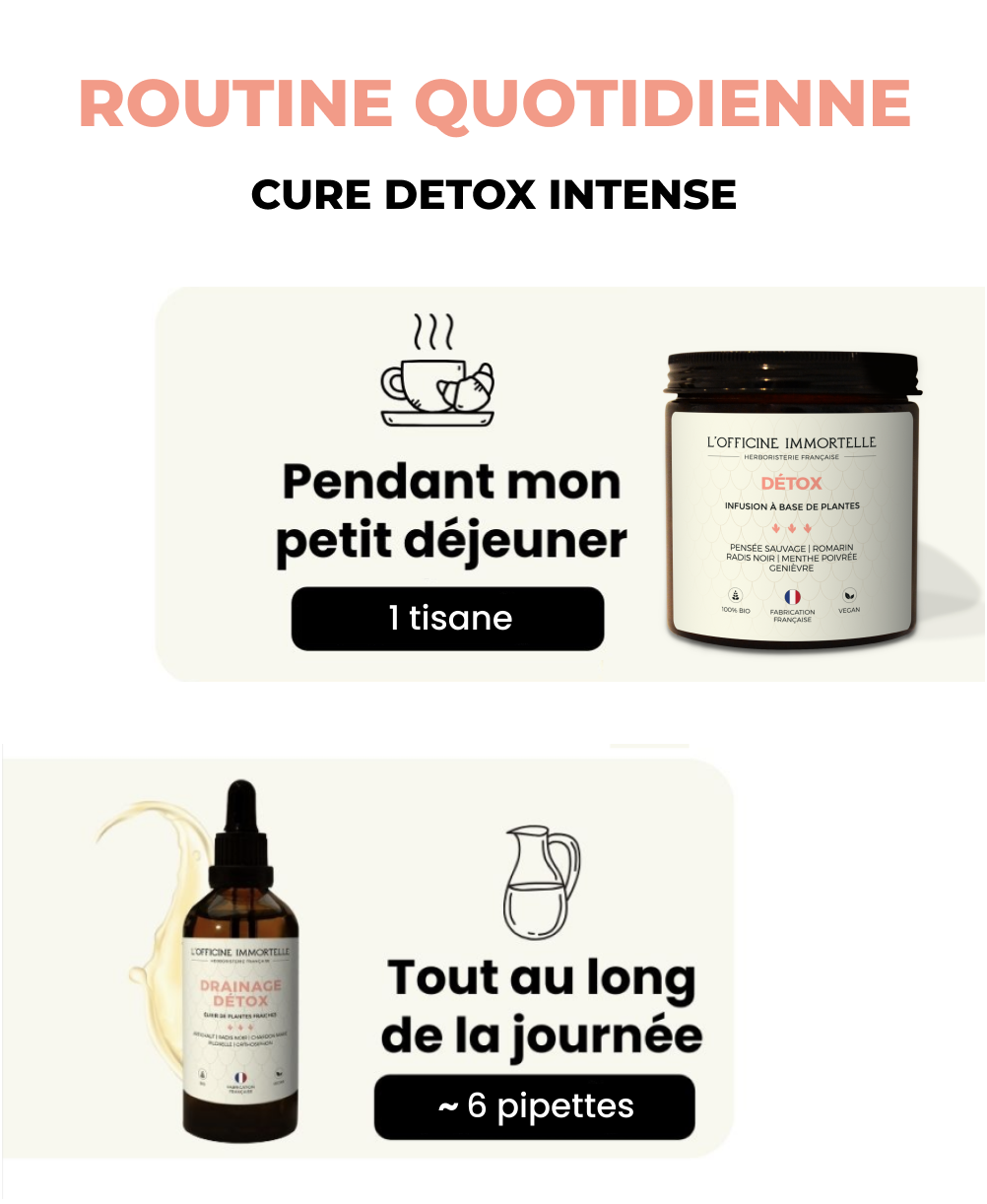 Complete your routine with the Detox Drainage Elixir, a composition of fresh plants such as artichoke, black radish, and milk thistle, designed to detoxify and drain. This elixir facilitates the elimination of toxins and brings lightness and well-being naturally.