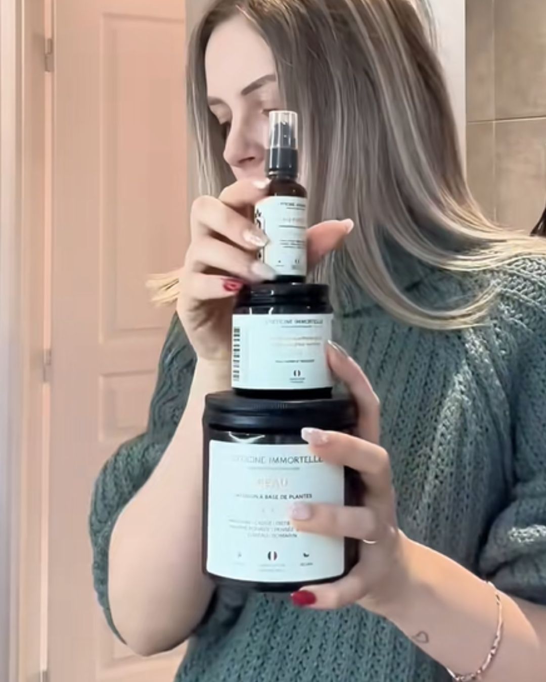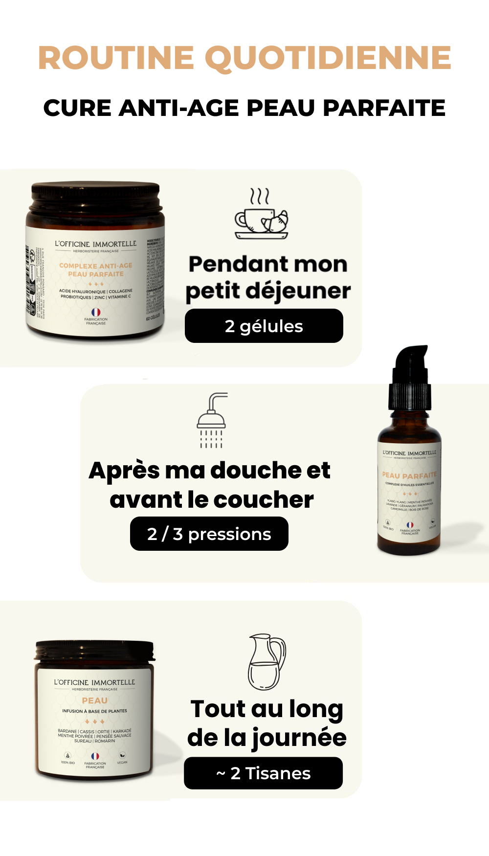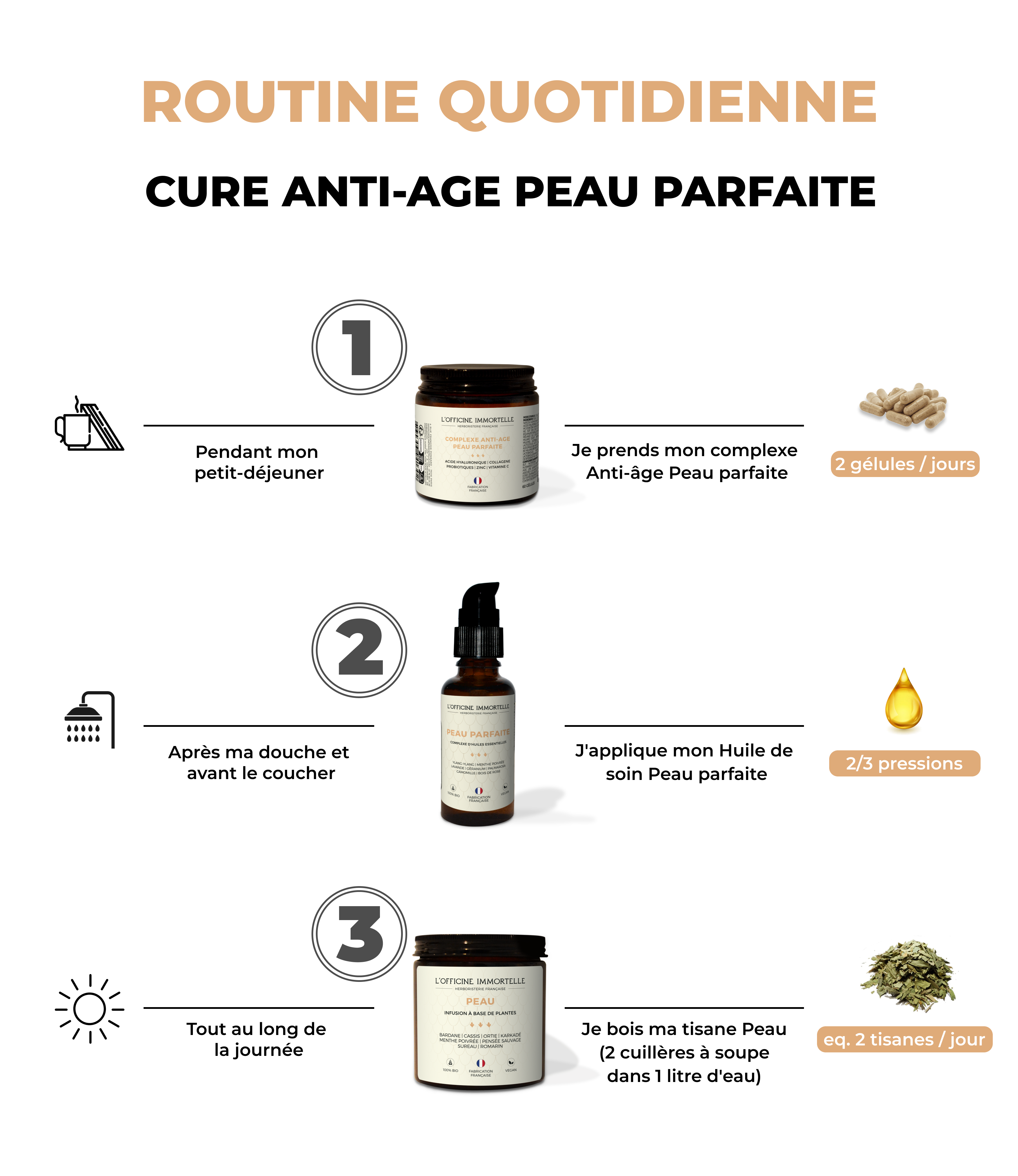 Conçue à partir d'ingrédients naturels soigneusement sélectionnés pour revitaliser votre peau de l'intérieur. L'huile de soin Peau Parfaite, enrichie d'Ylang-Ylang et de Lavande, apaise et nourrit, tandis que notre formule exclusive à base d'Acide Hyaluronique & CollagÚne Marin NaticolŸ redonne élasticité et fermeté. La Tisane Peau, mélange riche en Bardane et Pensée Sauvage, détoxifie et illumine votre teint.