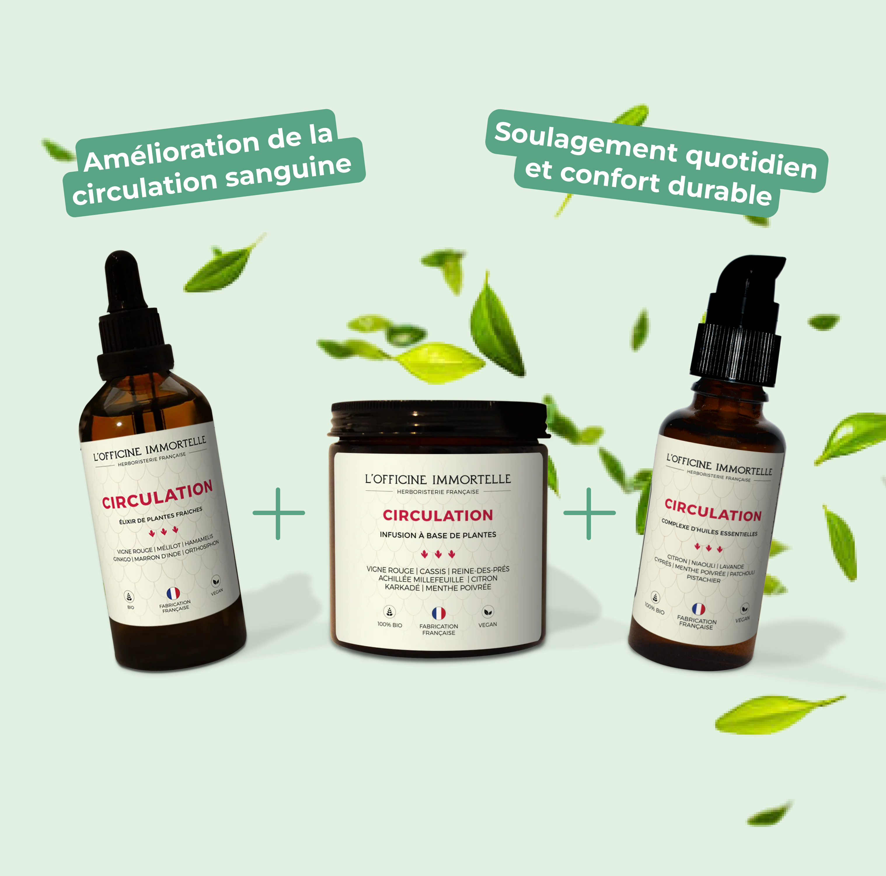 Redynamisez vos vaisseaux avec l'Élixir de plantes fraiches. Apaisez vos jambes lourdes avec notre Tisane. Vivez chaque jour avec énergie et légèreté.